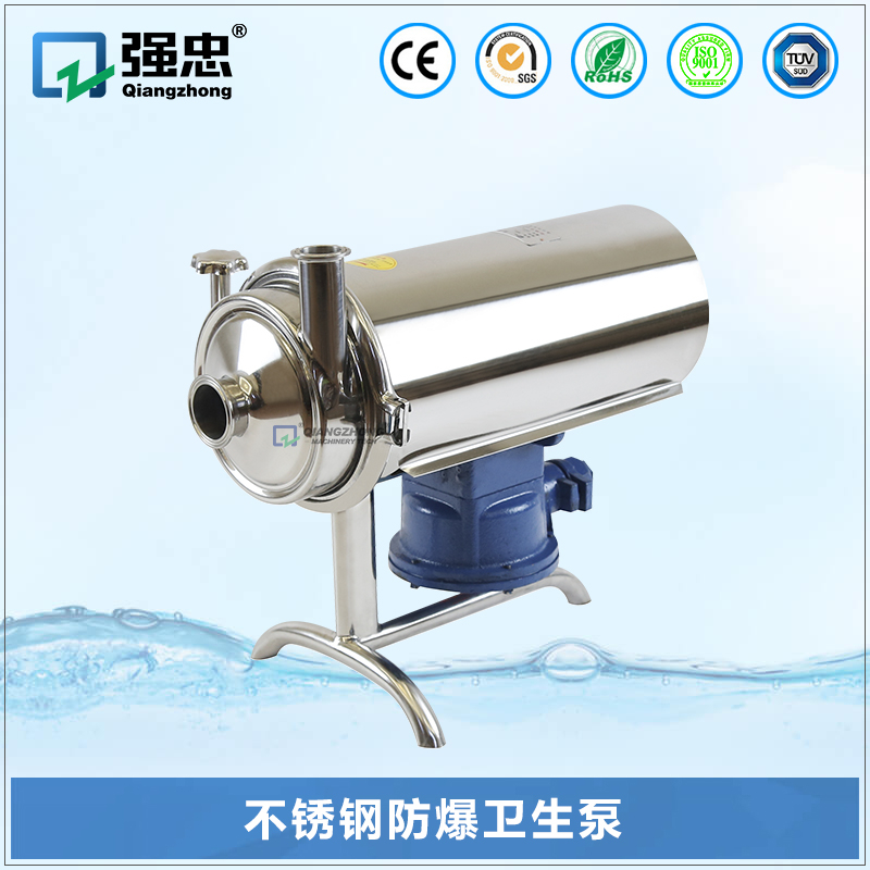 不锈钢卫生泵(又名奶泵、饮料泵)属单级、单吸式卫生泵,适合输送牛奶、饮料、酒等各种液体。它是食品、化工、医药等行业不可缺少的输送设备,特别适合于应用在管式杀菌、酸奶持温设备、CIP清洗等阻力较大的系统中。叶轮安置在泵壳里面,它和泵轴一起旋转,叶轮刀片以动能和压能的形式将能量传达给流体。该泵不可反向旋转,正确的旋转方向是顺时针,从电机后面可看出泵的旋转方向。